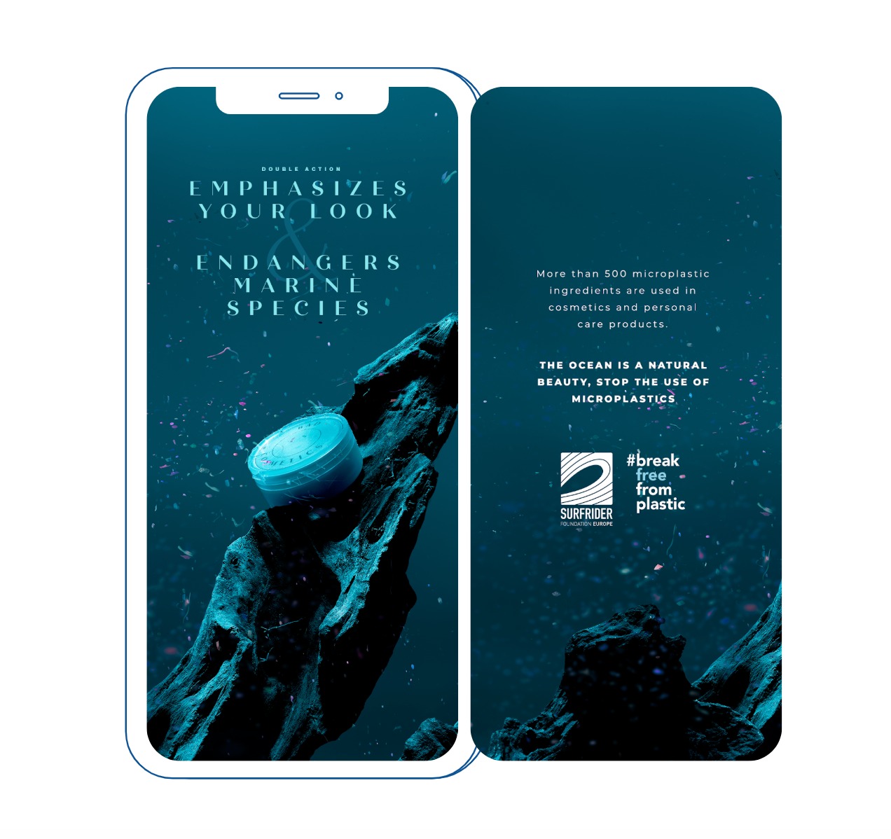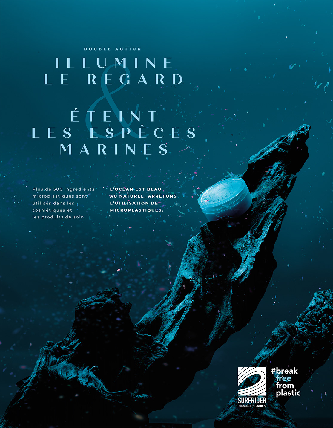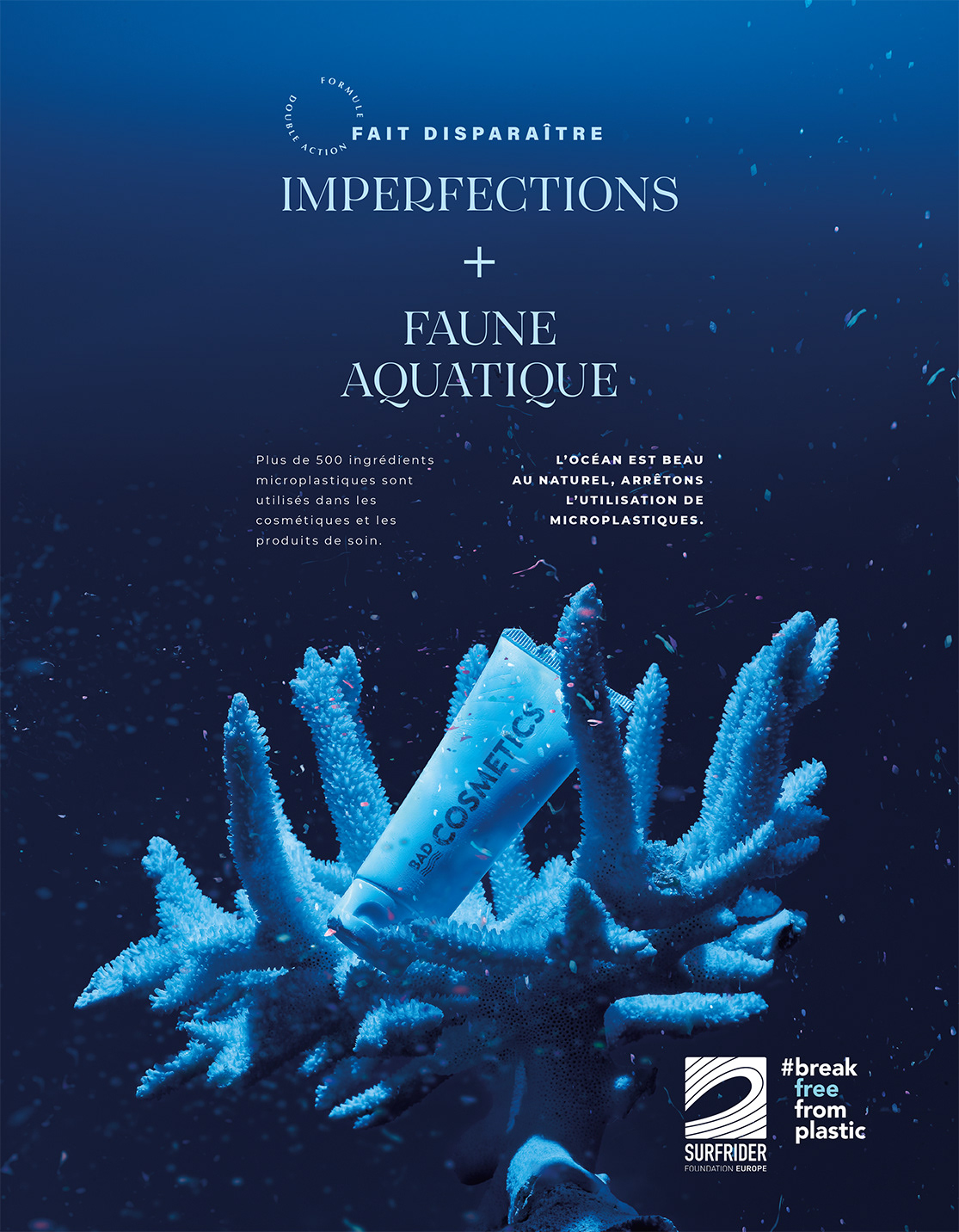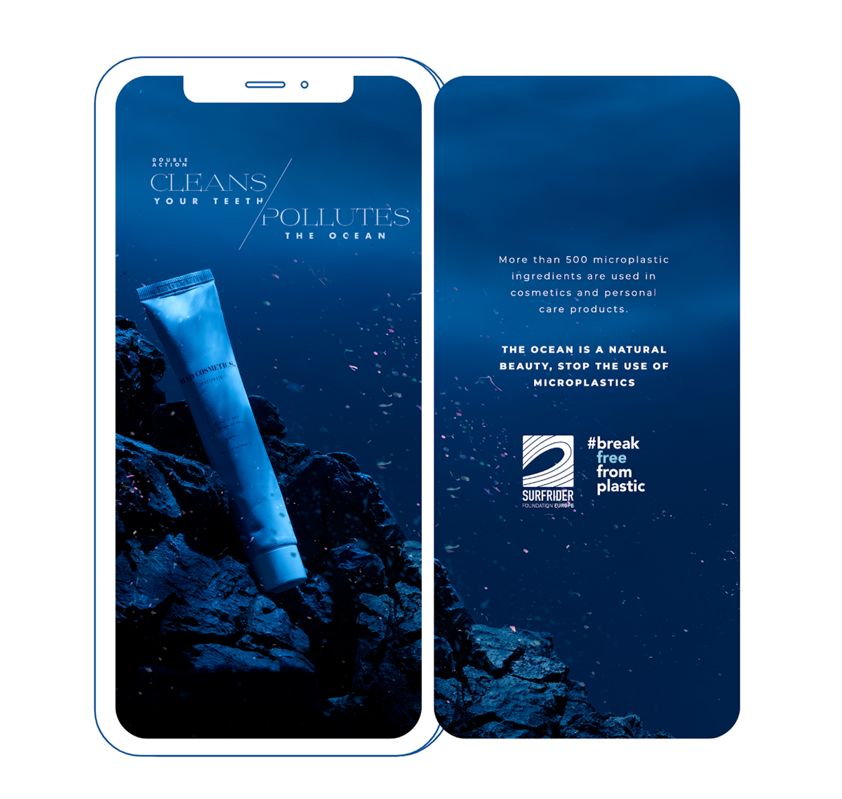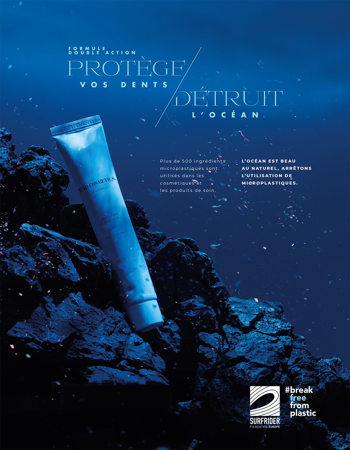 Print campaign to promote Surfrider Foundation's actions against the use of microplastic beads in cosmetic products.
